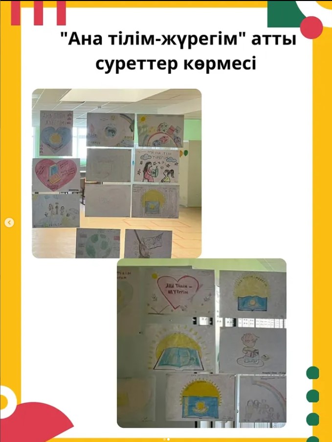 8қыркүйек күні "Тіл-халық қазынасы" атты тілдер апталығының өтуіне орай 1-2 сынып оқушылары "Ана-тілім жүрегім" тақырыбына суреттер көрмесін ұйымдастырды. Мақсаты:Балалардың ана тілінің қасиетін сезінуге, мәртебесін көтеруге баулып танымдық қабілетін арттыру. Тілді құрметтей білуге тәрбиелеу.