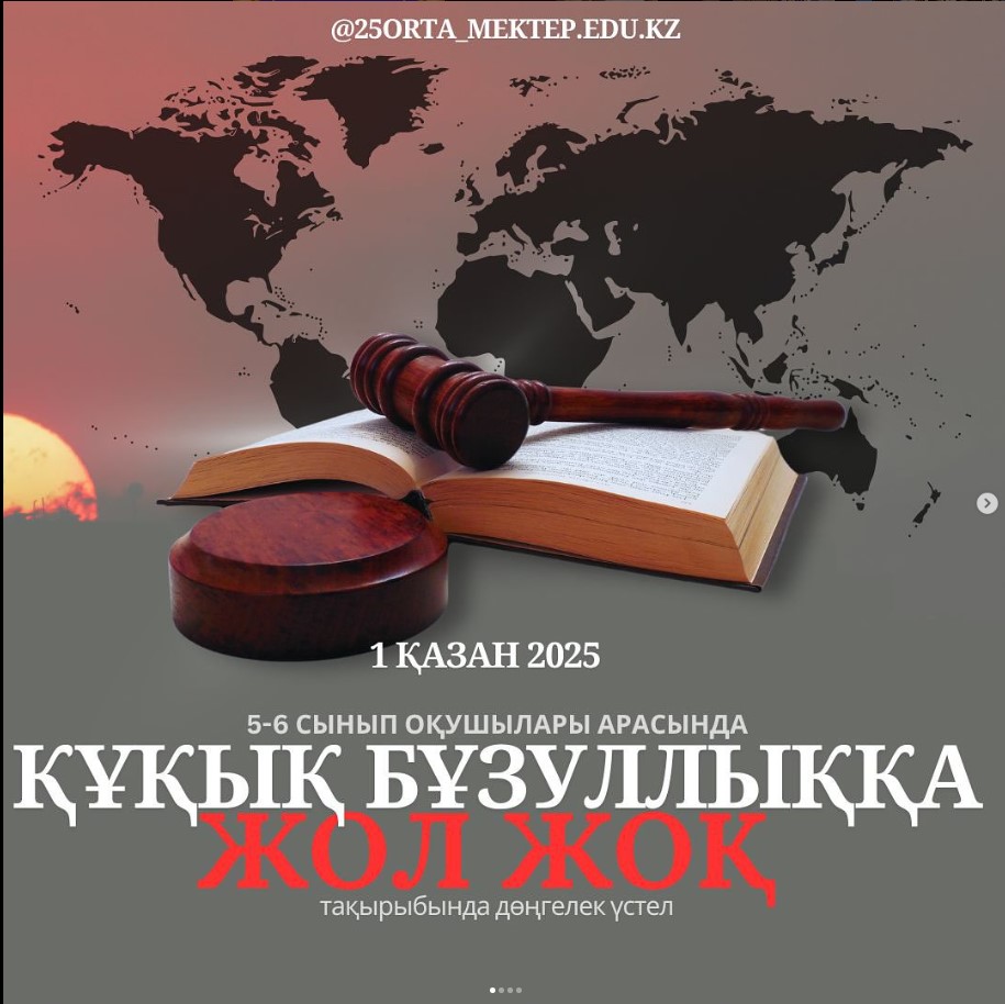 2025 жылғы 1 қазан күні мектебімізде 5–6 сынып оқушылары арасында *«Құқық бұзушылыққа жол жоқ!»* тақырыбында дөңгелек үстел өткізілді. Іс-шараның мақсаты – оқушылар арасында құқықтық сауаттылықты арттыру, құқық бұзушылықтың алдын алу, тәртіп пен жауапкершілікке тәрбиелеу.