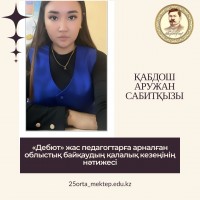Мектебімізден аталмыш байқауға екі жас маманымыз қатысып, биыл ұжымымыздың қатарына қосылған педагог-психолог Қабдош Аружан Сәбитқызы жүлделі ІІІ орынды иеленді. Аружан Сабитқызын жүлделі орынымен құттықтай отыра, алдағы уақытта да жеңістер тілейміз!