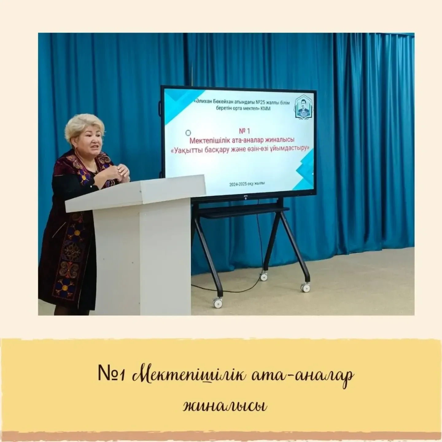 Ата-аналарды бала тәрбиесіне жауапкершілікпен қарауға шақыру, баланың бүгінгі істеген қадамы ертеңгі тұлға ретінде қалыптасуына үлкен әсер ететінін атап көрсету, мектеп ата-ана ынтымақтастығын нығайту мақсатында «Уақытты басқару және өзін-өзі ұйымдастыру» тақырыбында ағымдағы жылдың 13 қыркүйегінде №1 мектепішілік ата-аналар жиналысы өтті.