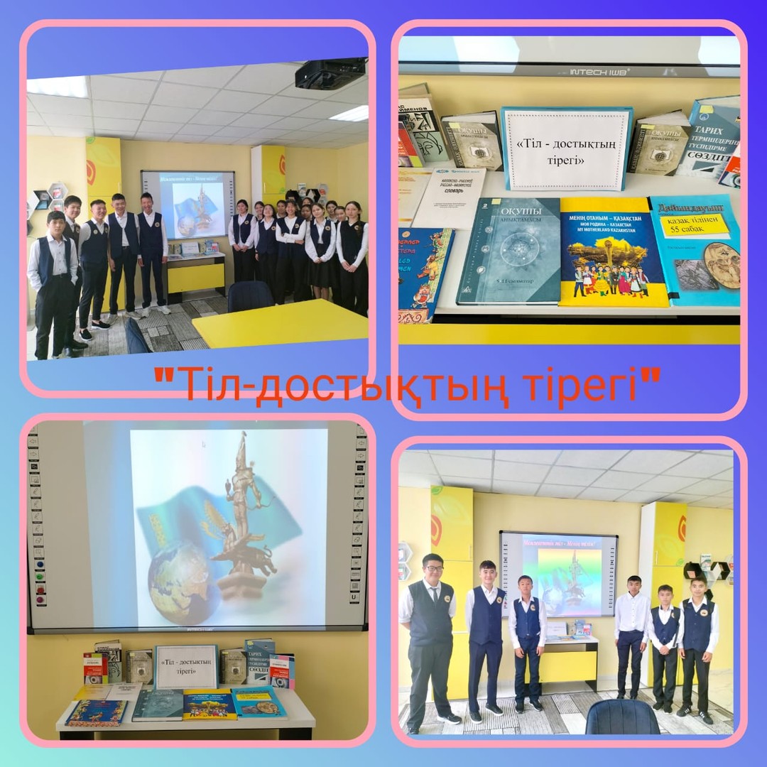Қазақстан халықтарының тілдері күніне орай мектеп кітапханасында " Тіл - достықтың тірегі" атты кітап көрмесі безендірілді.
