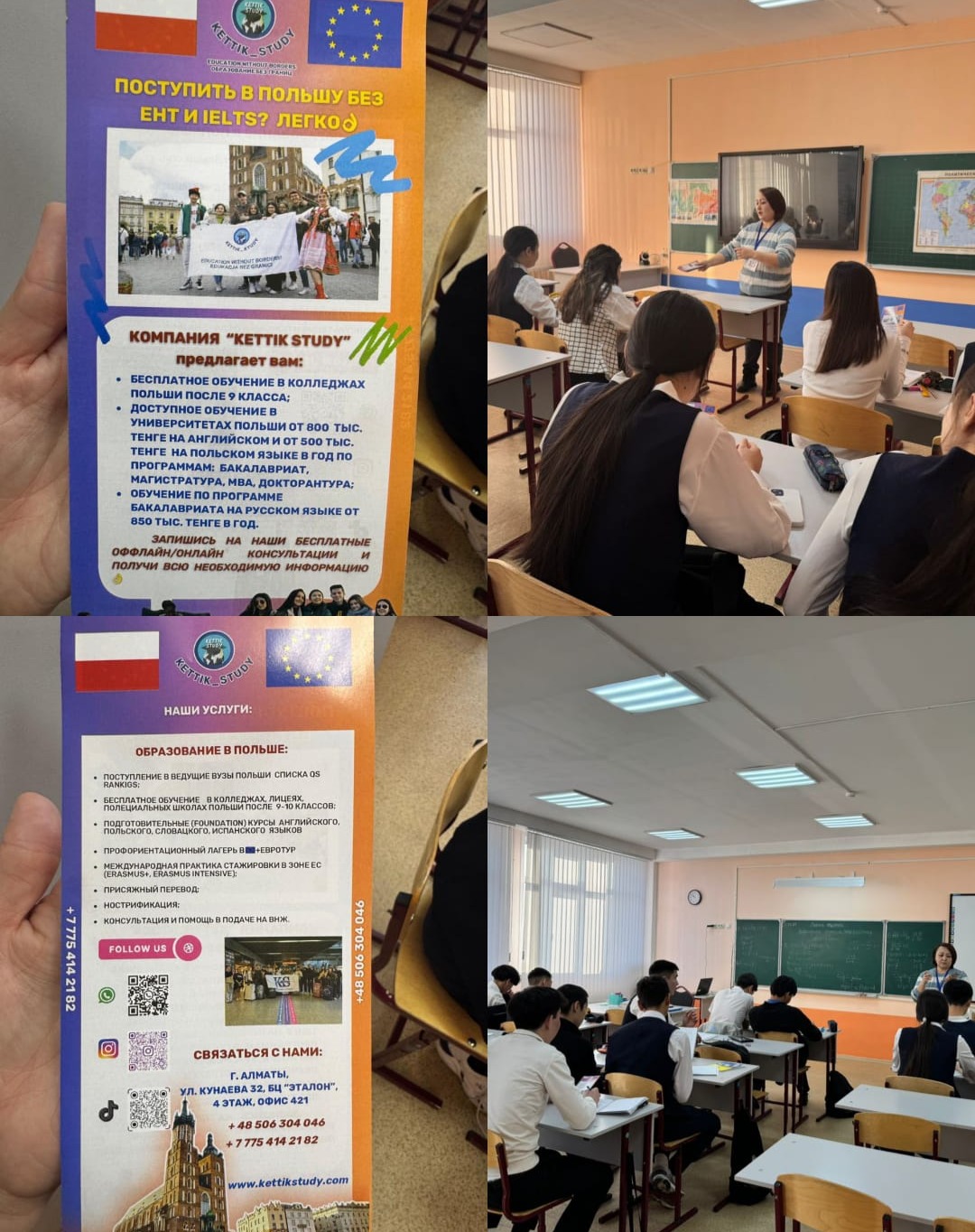 Қазіргі таңда оқимын деген ""БАЛАҒА" Мемлекет тарапынан кез келген жағдай жасалған, соның бірі "KETTIK _STUDY" білім ордасы. Бұл білім ордасы оқушыларға 9 сыныптан кейін Польша елінде ұлттық бірыңғай тестілеусіз өз қызметтерін ұсынады. Осындай құнды ақпараттарымен оқу орлағының бас маманы Кулбаева А.Е. оқушылармен үгіт насихаттау жұмысын жүргізді. Оқушылар тарапынан кері байланыс сұрақтары қойылды.