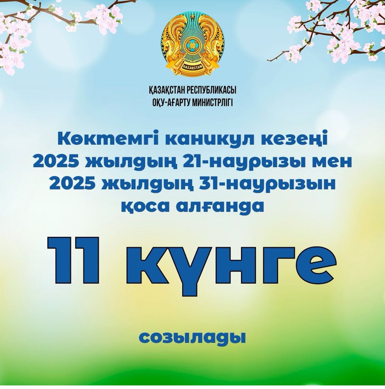 Көктемгі каникул кезеңі 2025 жылдың 21-наурызы мен 2025 жылдың 31-наурызын қоса алғанда 11 күнге жалғасады.