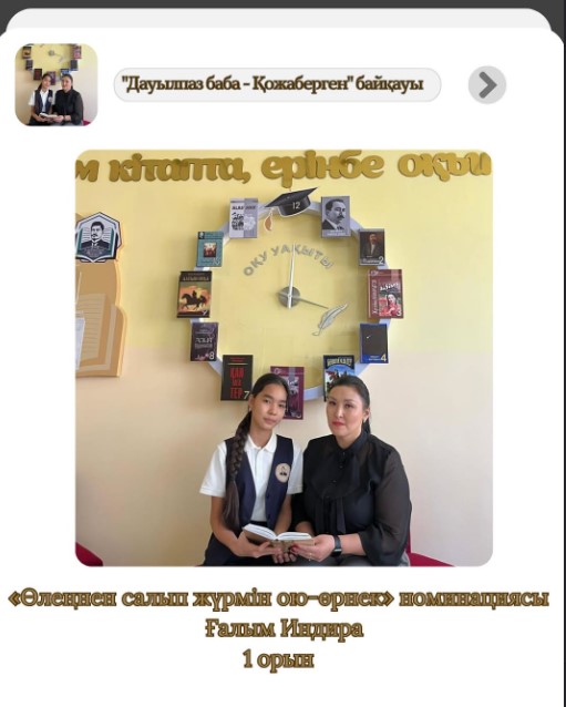 Облыстық “Дауылпаз баба - Қожаберген” байқауының қалалық кезеңінде «Өлеңнен салып жүрмін ою-өрнек» (жазба ақындар байқауы) номинациясында 9 сынып оқушысы Ғалым Индира 1 орын иеленіп, облыстық кезеңге жолданама алды. Жетекшісі мектебіміздің қазақ тілі мен әдебиеті пәні мұғалімі Елубай Гүлнұр Амантаевна. Шын жүректен құттықтай отыра келесі кезеңде де сәттілік тілейміз!