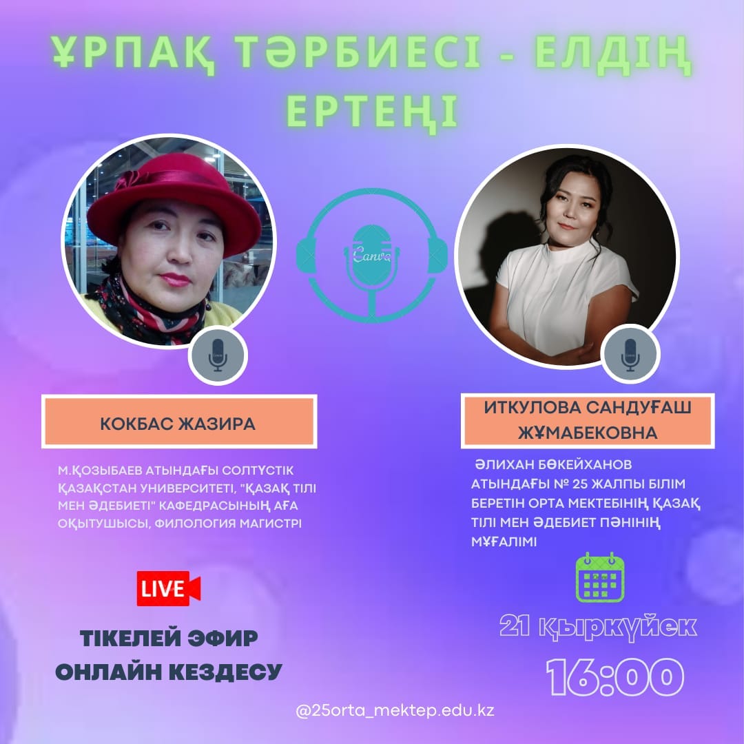 21.09.2023 күні сағат 16:00 мектебіміздің инстаграм парақшасында «Ұрпаққа Аманат» атты бағдарламаның «Ұрпақ тәрбиесі – елдің ертеңі» тақырыбында екінші тікелей эфир өтеді.Тікелей эфир қонағы Әлихан Бөкейхан атындағы № 25 жалпы білім беретін орта мектебінің қазақ тілі мен әдебиет пәнінің мұғалімі Иткулова С.Ж. және М.Қозыбаев атындағы Солтүстік Қазақстан университеті, «Қазақ тілі мен әдебиеті» кафедрасының аға оқытушысы, филология магистрі Кокбас Жазира.
