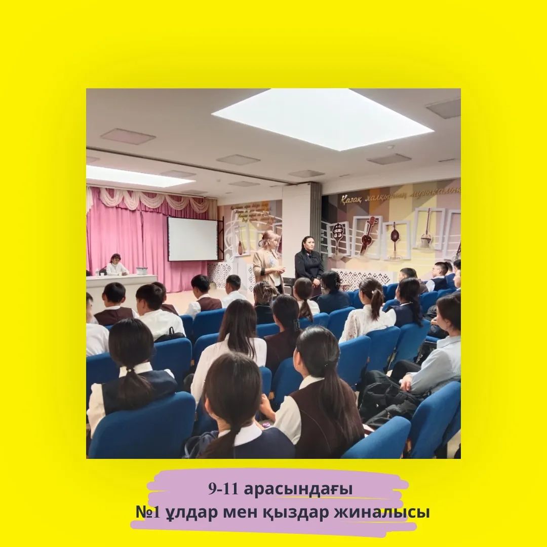Бүгін мектебімізде жоспарға сәйкес №1 ұлдар мен қыздар жиналысы өткізілді. Жиналыста директордың тәрбие ісі жөніндегі орынбасары Г.А. Елубай ұлдар мен қыздардың тәртібі, сабаққа қатысуы, сабаққа кешікпеу, форма мәселесі, жалпы мектептің ішкі тәртіп ережелерімен таныстырды.Мектебіміздің әлеуметтік ұстазы Д.Р.Ескожина оқушыларға құқықбұзушылықтың алдын алу, қазақ отбасындағы ұл мен қыз тәрбиесінің ерекшеліктері, қоғамдық ортада өзін-өзі қалай ұстау керектігі жайлы сөз қозғалды.